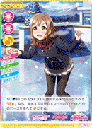 【등장 시】당신의 덱 위에서부터 카드 2장을 전언에게 보여준다. 그 중에서 멤버1명을 핸드에 추가하고, 남은 카드는 원하는 순서대로 뒤집어서 덱 제일 아래에 둔다. 아래에 둔 것이 전부 「카난」이라면, 핸드에서 【LIVE】를 가진 「카난」1명을 《등장》시킬 수 있다. |