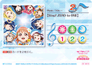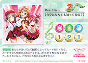 【등장 시】당신의 무대에 있는 멤버가 전부 「리코」이고, 당신의 세트 리스트에 있는 공개된 악곡 카드가 2색 이상이 있다면, 다시 1턴을 갖는다. |