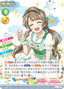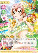 【등장 시】당신의 대기 중인 멤버에 「코토리」가 있다면, 카드를 1장 뽑는다. 【라이브 성공 시】이 《라이브》에 「하나요」가 참가하고 있다면, 카드를 1장 뽑는다. |