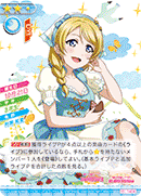【등장 시】당신의 대기 중인 멤버에 「니코」가 있다면, 카드를 1장 뽑는다. 【라이브 성공 시】이 《라이브》에 「에리」가 참가하고 있다면, 카드를 1장 뽑는다. |