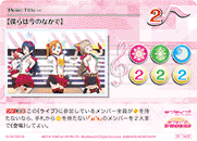 【라이브 성공 시】당신의 무대에 「호노카」「코토리」「우미」「하나요」「린」「마키」「니코」「에리」「노조미」가 있다면, 다시 1턴을 갖는다. |