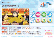 【등장 시】당신의 덱 위에서부터 4장을 전원에게 보여주고, 그 중에 있는 【RUSH】나 【LIVE】나 라이브 의상을 가진 「μ’s」의 멤버를 각각 1명씩 핸드에 추가한다. 그 후, 남은 카드는 뒤집어서 잘 섞고 덱 제일 아래에 둔다. |