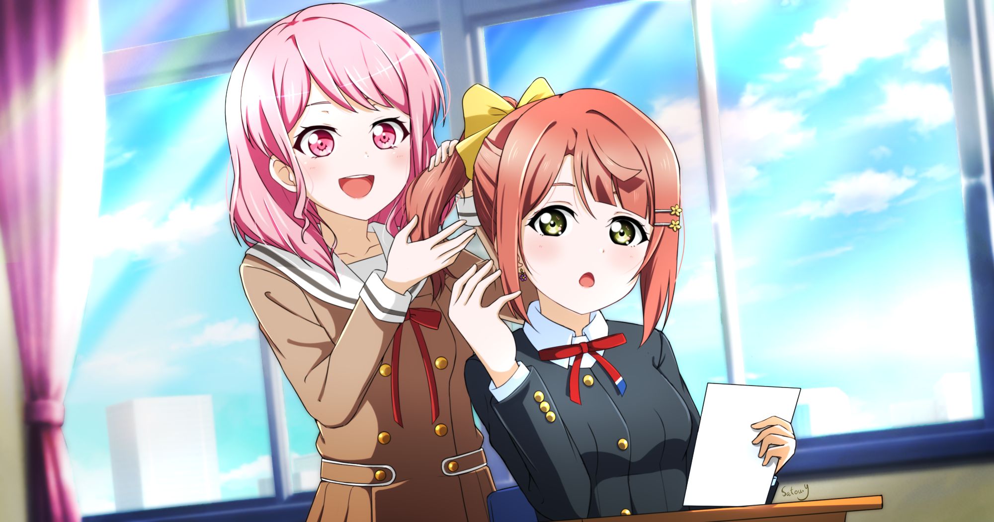 『트윈테일의 비밀!?』 니코 : ……아까부터 빤히 쳐다보고 뭐야, 아유무. 뭐, 니코에게 홀딱 빠져버리는 기분은 알겠는데 아유무 : 죄, 죄송해요. 새삼 니코 씨의 트윈테일, 귀엽다고 생각했어요…… 니코 : 아아, 그러고 보니 아직 이 트윈테일이라고 하는 무기의 비밀은 이야기하지 않았었네 아유무 : 네!? 거기에도 비밀이 있는 건가요!? 제가 얼마 전에 배웠던 비밀은 아직 일부였던 거군요…… 니코 : 맞아. 니코는 비밀이 많은 스쿨 아이돌이기도 해! 하지만 먼저 이 트윈테일에 대해서 어떻게 생각하는지 말해주지 않을래? 아유무 : 네. 루비나 엠마 씨, 란쥬도 머리를 묶고 있지만 그것과는 또 다르다고 생각하며 보게 돼요. 니코 씨 같은 트윈 테일은 활발하고 활기 넘쳐서 귀여운 니코 씨에게 딱이에요. 니코 : 잠깐…… 너, 잘 알고 있잖아! 역시 니코의 비밀을 배울만하네 아유무 : 진짜요? 에헤헤, 기뻐요 니코 : 여기로 오라구, 아유무도 트윈테일 해줄게 아유무 : 네에!? 저, 저에게는 아직 일러요! 니코 : 괜찮다니까, 괜찮아. 아유무에게도 니코의 비밀을 나눠줄게♪
