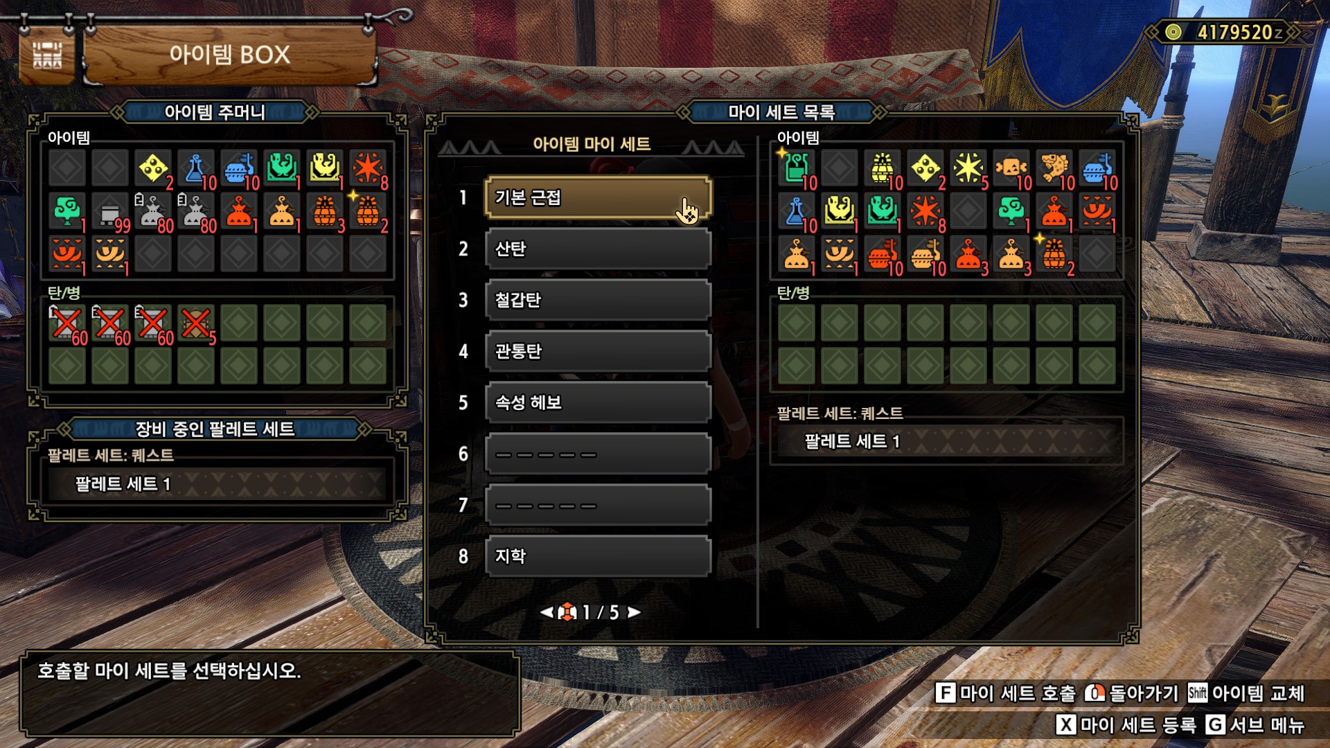 아이템 주머니에 원하는 아이템들을 세팅하고 그걸 자주 쓴다싶으면 아이템 박스 ㅡ> 아이템 관리 ㅡ> 아이템 마이 세트로 가셔서 등록하시면 편하게 사용할수있습니다. 사냥한뒤 여러가지 채집한것들도 마이세트 딸깍 하면 아이템 박스로 이동되서 편함 사용한 소모품들도 딸깍 하면 모품되서 한번 해두면 매우 편하답니다. | 24.10.13 18:16 | |