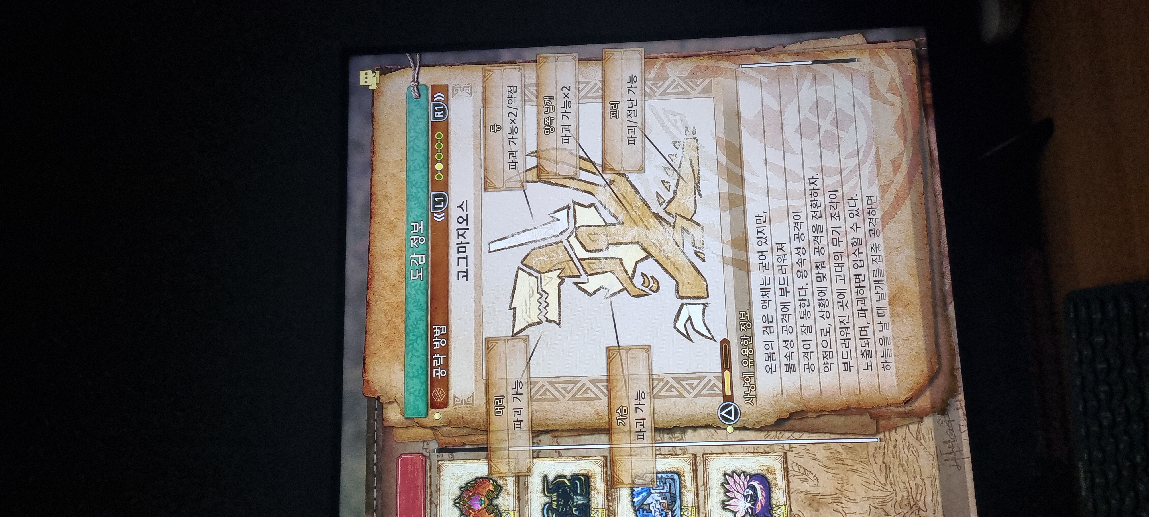 또 생각나는 건 도도블랑고 : 앞다리 상처 파괴 (옛날에는 엉덩이) 도감에 약점 노출이라고 써진 건 각 몬스터들 필살기 이후 약점 공격 가능한 그런 건데, 대부분 발광하는 데다 다운도 짧아서 별로입니다. 대경직 개념과는 살짝 다릅니다.