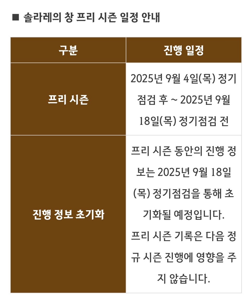 아~ 일정 확인은 업데이트 부분에서 확인 가능 합니다. 이번 솔라레 일정 같은 경우는 9월4일 업데이트 내역에서 확인 가능 합니다. | 25.09.20 04:05 | |
