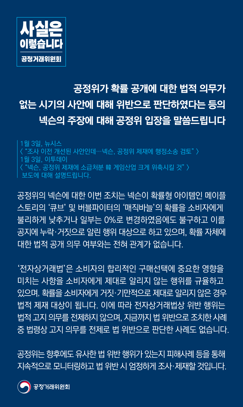 공정위의 넥슨에 대한 이번 조치는 넥슨이 확률형 아이템인 메이플스토리의 ‘큐브’ 및 버블파이터의 ‘매직바늘’ 의 확률을 소비자에게 불리하게 낮추거나 일부는 0%로 변경하였음에도 불구하고 이를 공지에서 누락하거나 거짓으로 알린 행위를 대상으로 하고 있으며, 확률 자체에 대한 법적 공개 의무 여부와는 전혀 관계가 없습니다.