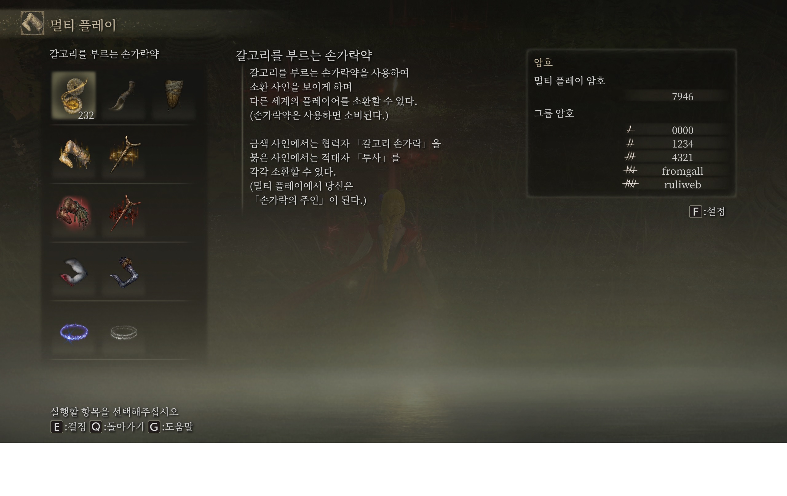 룬은 제가 드릴수 있는게 투사일때는 한계가 있긴하지만. 최대한 드릴테니. 엘레의 교회에서 손가락 싸인 긋고 기다리세요. 비번은 7946으로 하시고. 마리카로 들어갈겁니다. | 25.01.15 13:59 | |