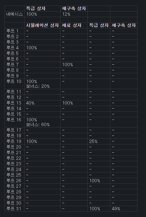 하강 재구축상자 보상은 네메시스 처치시 층수에 관계없이 50% 다음 완료시 15층 75% 18층 90% 25층/30층 100% 입니다