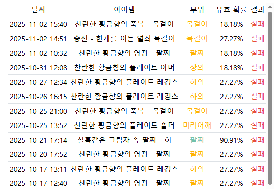 이건 마나도 그렇고 내구소모도 4번 나눠쓸때마다 내구소모 확률이 별개로 작용하는건지 무기 내구도도 순삭됨ㅋㅋㅋㅋ 헬돌거나할땐 스킬스타일 따로 찍고 흑영섬vp안찍은 트리로 도는중.. | 25.11.02 20:14 | |