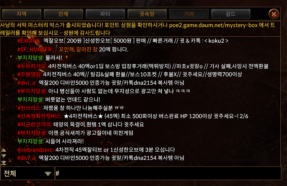이 게임의 민낯 ㅋㅋ 전체쳇에 사람은 없고 광고쟁이들만 득시글 거리고 얼엑게임인데 게임내에서 공식새끼가 랜덤박스 광고질