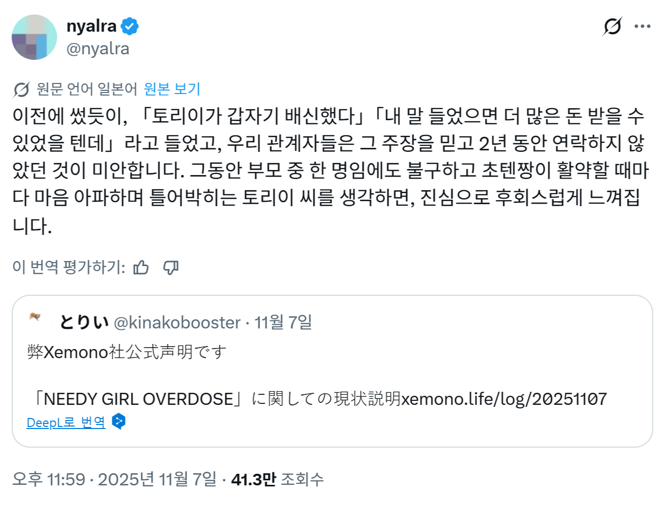 원작자인 냐루라 또한 최근 니디걸 데스크탑 메이트 콜라보 관련으로 감수도 하지 않은 상태이고 공식 계정과도 언팔 상태 | 25.11.10 08:51 | | |