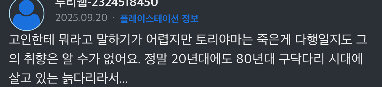 지 취향에 안맞다고 고인에게 죽은게 다행 이 ㅈㄹ ㅋㅋㅋㅋㅋ 진짜 인성 개 파탄자급 인간 아니면 할 수 없는 말 ㅋㅋㅋㅋ | 25.11.13 19:45 | | |