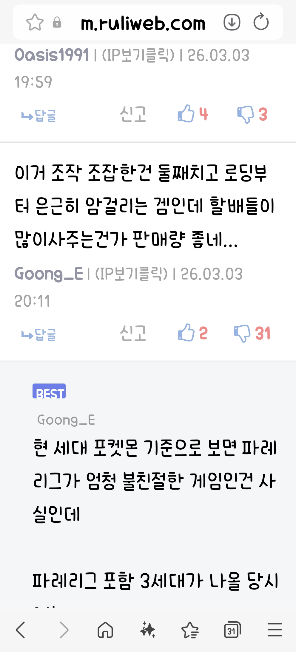 현 세대 포켓몬 기준으로 보면 파레리그가 엄청 불친절한 게임인건 사실인데 파레리그 포함 3세대가 나올 당시에는 1~2세대에 비해 색감도 좋아지고 편의성도 엄청 개선되서 호평이 많았던 게임이었죠 파레리그 출시된 2004년 초창기에 인기 정말 장난이 아니었죠 | 26.03.03 20:21 | | |
