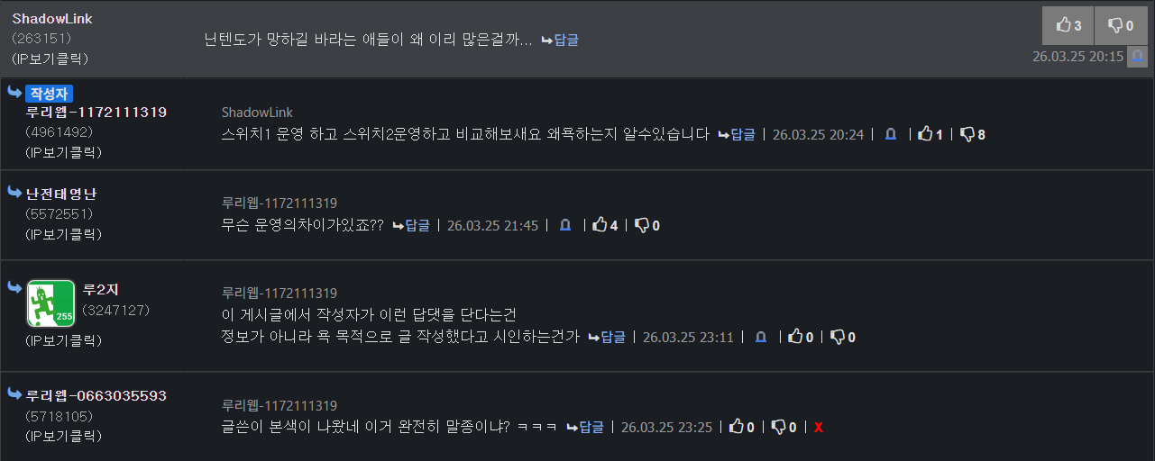 스위치1 운영 하고 스위치2운영하고 비교해보새요 왜욕하는지 알수있습니다 | 26.03.25 20:24 | | |