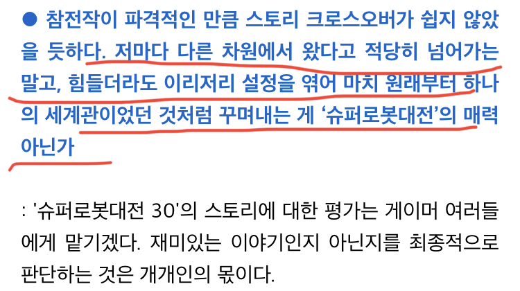 : '슈퍼로봇대전 30'의 스토리에 대한 평가는 게이머 여러들에게 맡기겠다. 재미있는 이야기인지 아닌지를 최종적으로 판단하는 것은 개개인의 몫이다.