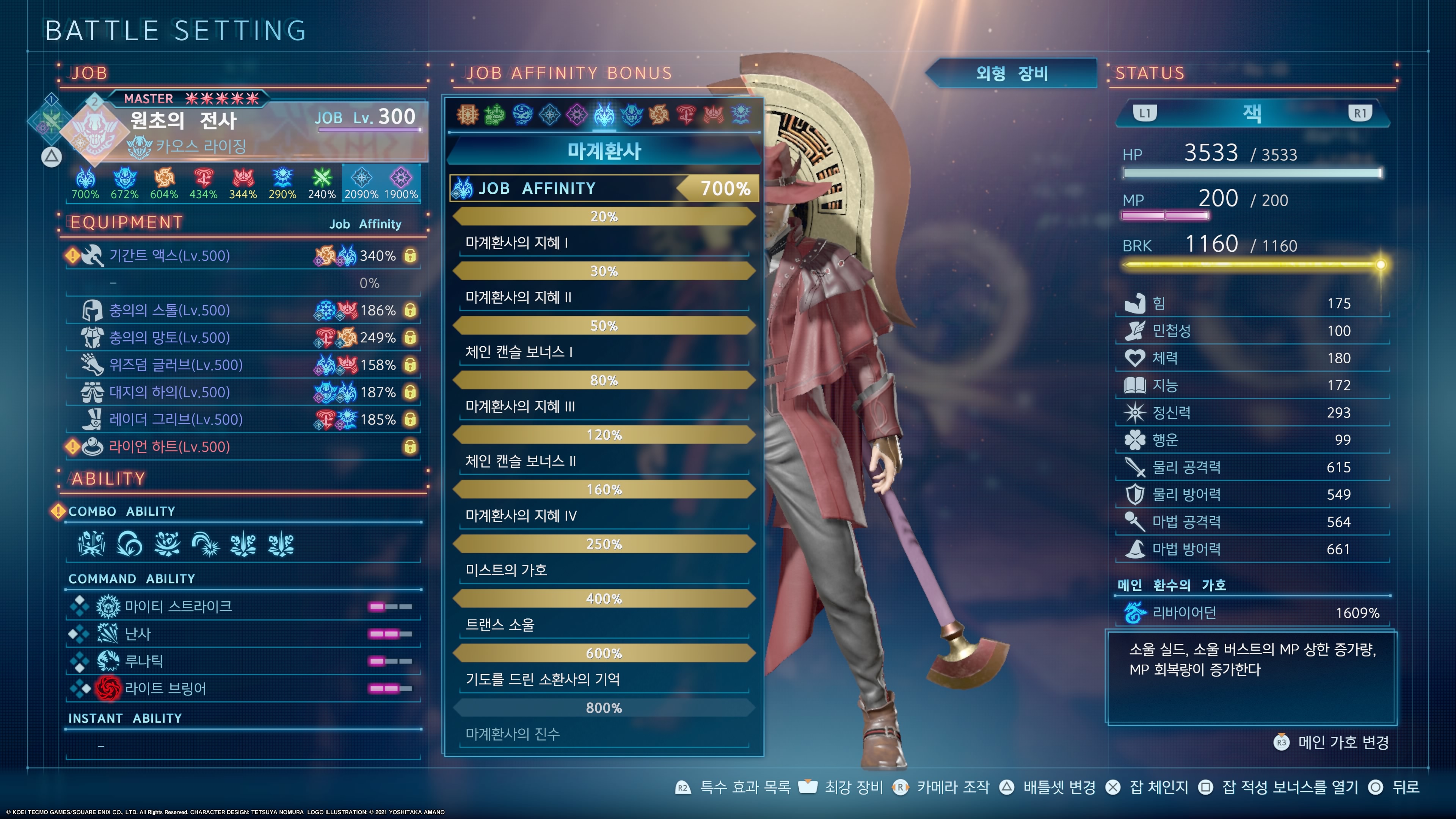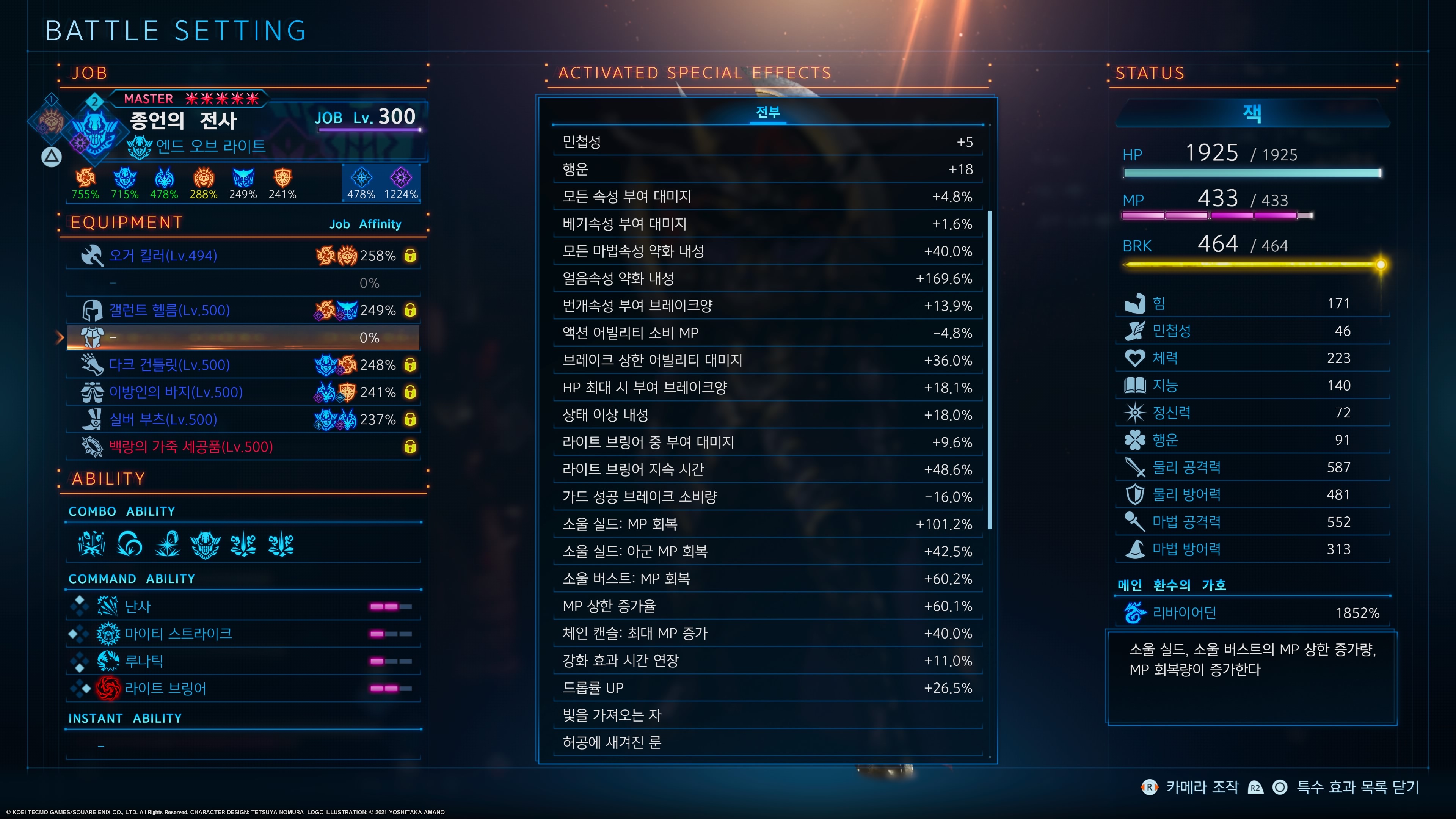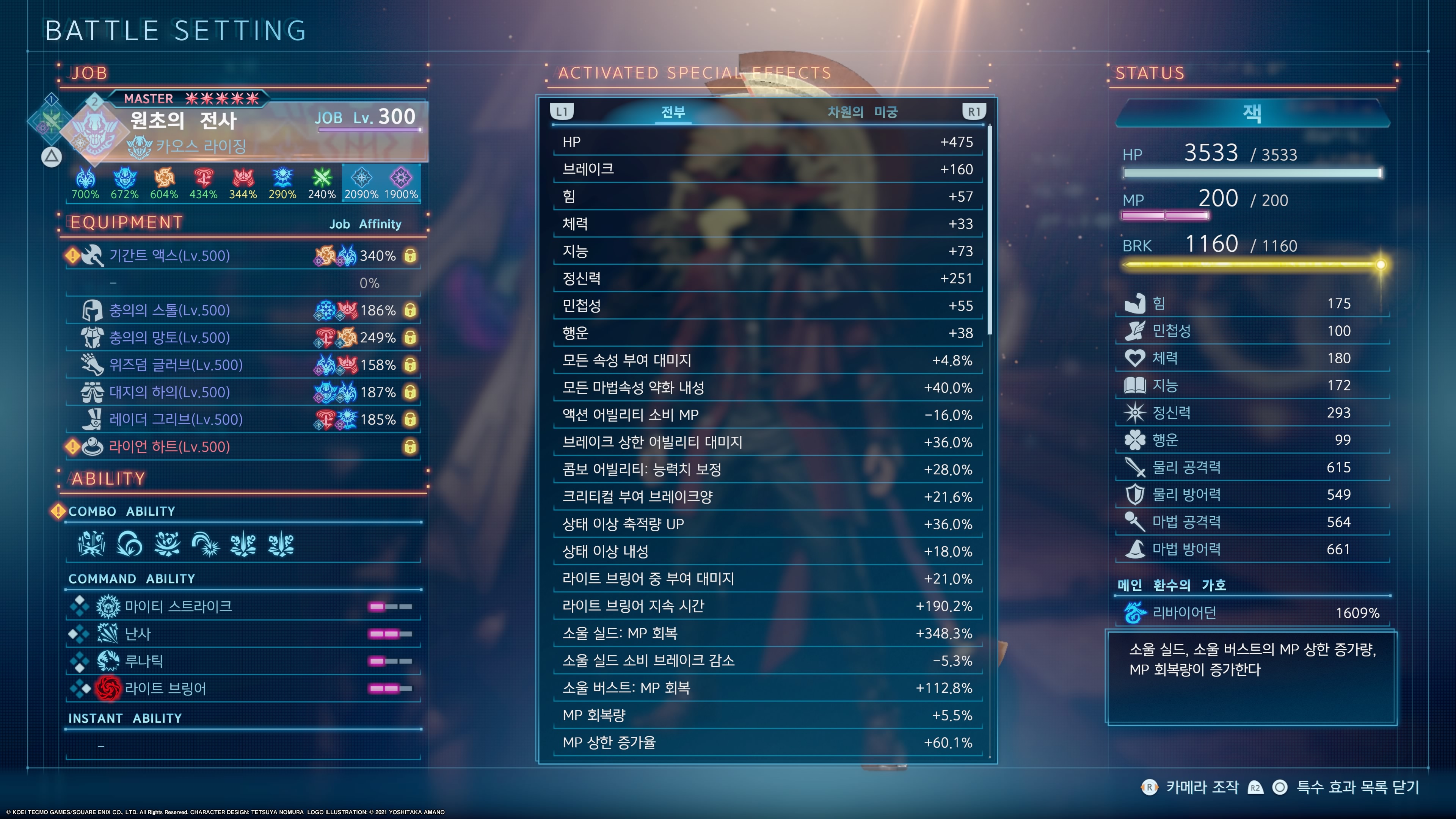 미궁이 아닌 위의 영상과 같이 월드맵에서의 능력치입니다. 월곡님의 서브잡의 원초의 기사여서 저도 원초의 기사로 서브잡 세팅하고 마스터포인트는 소울실드mp,소울버스터mp,마나 상한 증가 40만 찍고 다른 능력치는 찍지 않았습니다. 그리고 장비를 하나 빼서 리바이어던 적성도 맞춰봤습니다. 근데 마나 상한이 까이지 않습니다.(…) | 24.10.16 22:45 | |
