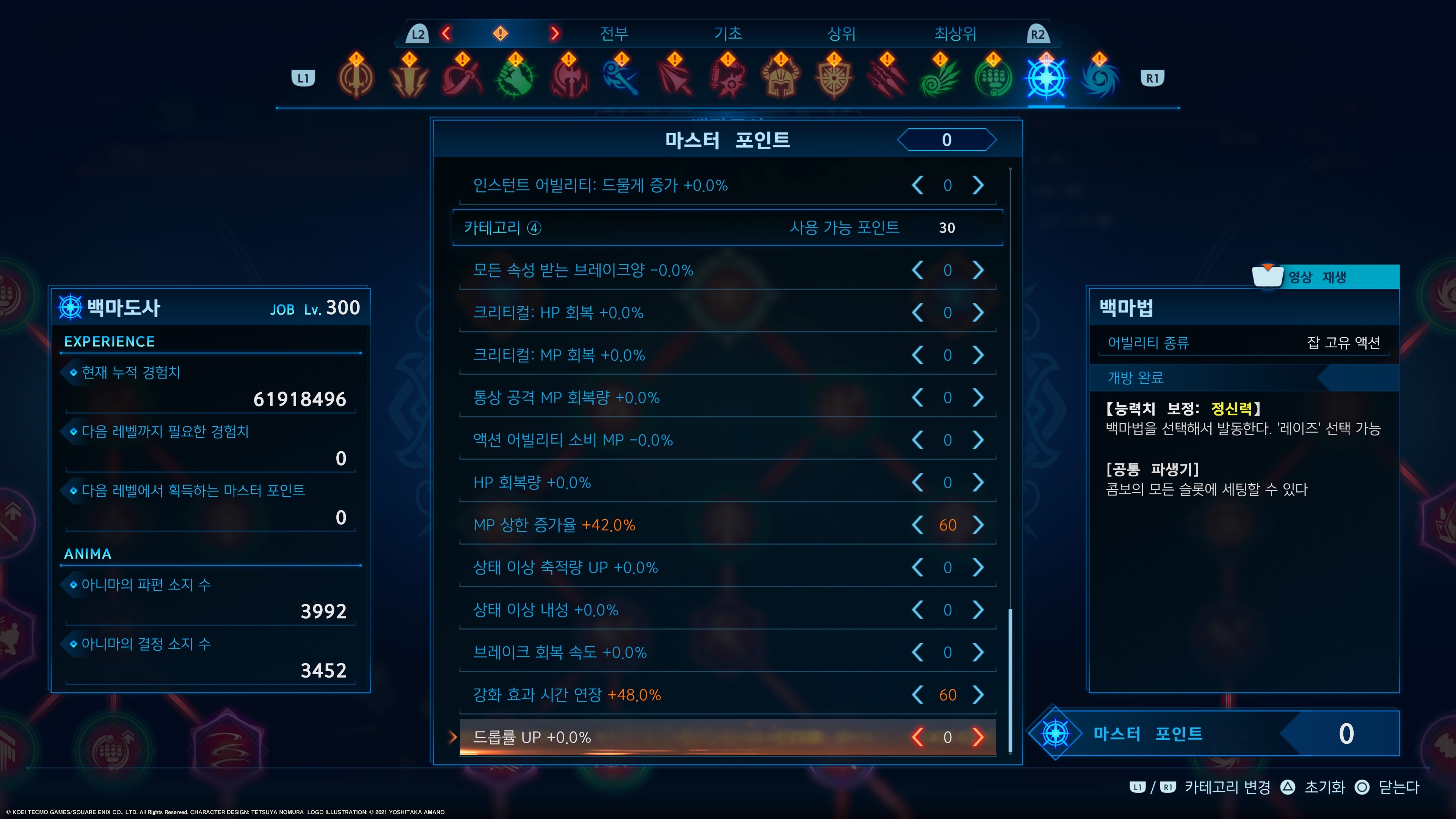 그래서 저도 일단 소울 실드와 소울 버스트의 mp회복을 마스터 포인트로 끝까지 올려보았습니다. 그리고 mp 상한 증가율은 임페리얼