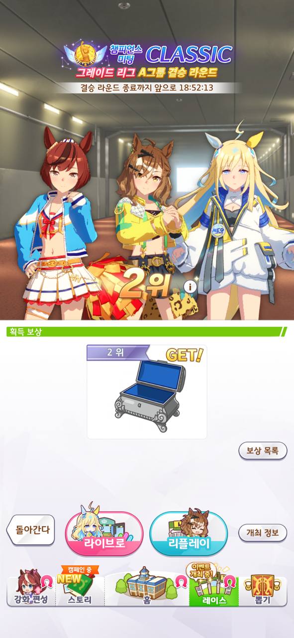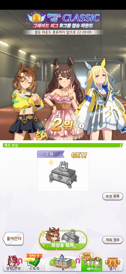 저도 윗분과 같은 B결 2위.... 토센조던 쭉쭉 치고나가면서 한껀 해주나 했지만 상대방 유니에게 당했습니다.ㅠ.ㅜ 1착 잘 해주던 포켓은 마군사 당해 8착.... 이번 챔미가 대부분 선입이 많이 나온지라 뚫고 나가지 못하면 그대로 지는경우가 많았다는......;;; 여튼 고생하셨고 2위라 아쉬움이 남으시겠지만 그래도 A결 2위도 대단하다 생각합니다.