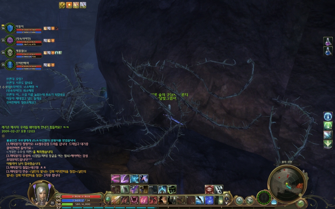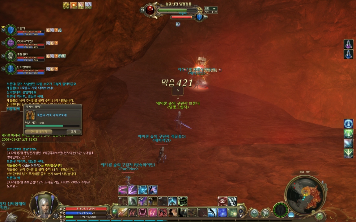 그리고. 이거... 스샷의 레이더를 주목해 주세요. 제가 있는 위치에서 오른쪽으로 2시 방향에 빨간 점 세 개가 뭉쳐 있는 거 보이십니까? 이 중 가운데가 불신 네임드 몹 중 하나인 용암의 카트네리가 있는 곳입니다. 여기서 바로 확인이 가능하죠.