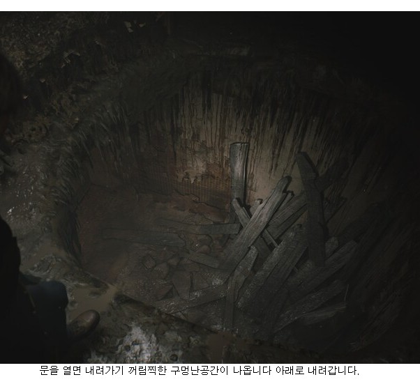 문을 열면 내려가기 꺼림찍한 구멍난공간이 나옵니다 아래로 내려갑니다.