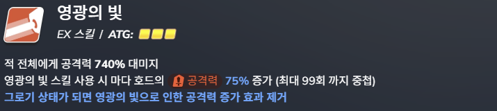 - 영광의 빛 패턴 공증 계수 75% (토먼트 50%). 단, 공증 효과 제거 기믹 존재 (그로기 시)