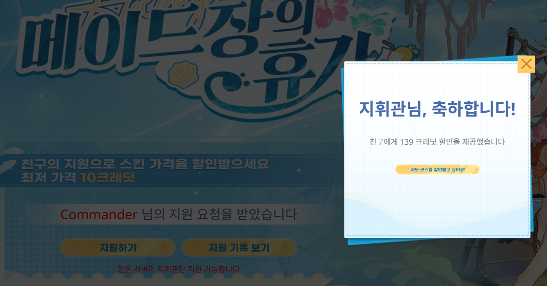 이벤트를 공유해서 스킨 할인을 받으세요! 코스튬 「레이시와의 50일」을 최저 10크레딧에 구매할 수 있는 찬스!