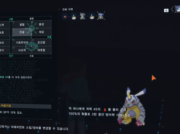 보시다피시 용맹쪽에 해당하는 우측상단으로 이동한걸 볼 수 있죠. 이제 다시한번 용맹 성향 선택지를 선택하면