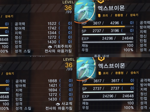 복제 가능한 엑스브이몬 덕분에 똑같은 스탯에서 변화를 알아볼 수 있었습니다.