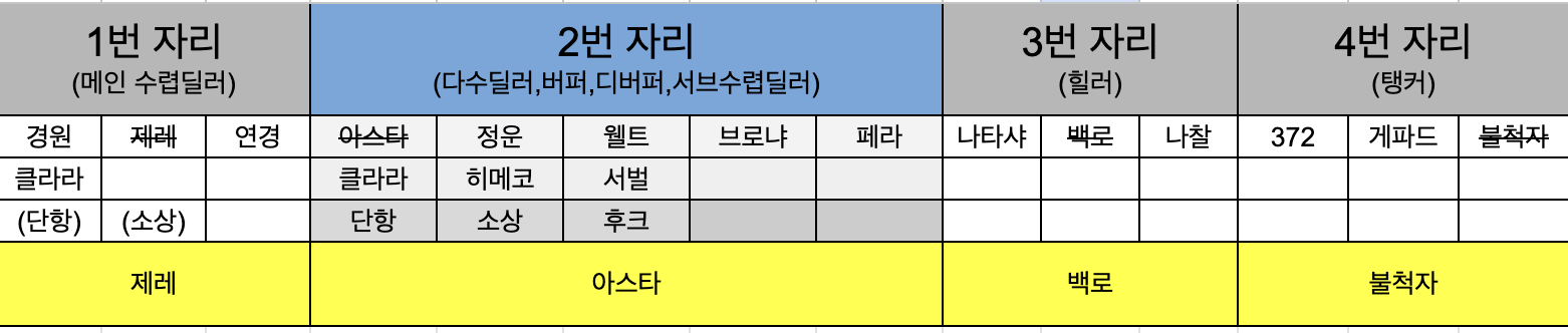 ==제일먼저 1번자리에 딜 고점이 높은 메인 딜러를 배치합니다