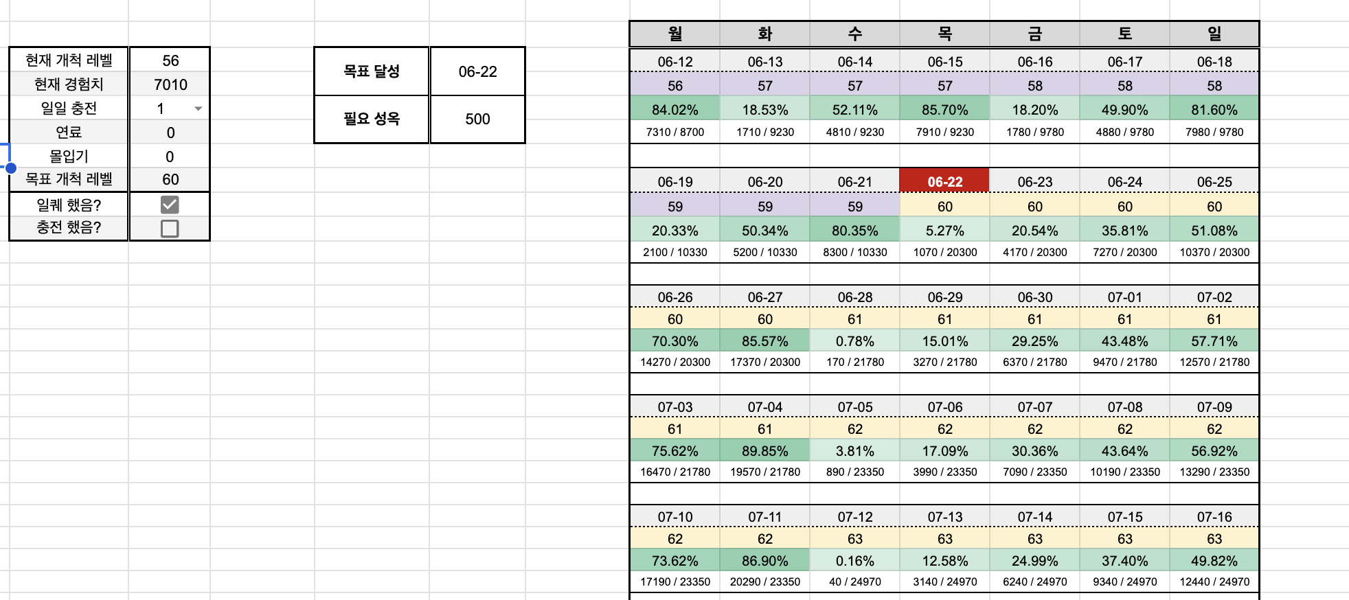 예시 ) 6월 22일 개척렙 60이 될테니 다음주에는 주간보스를 금토일에 잡는것을 추천