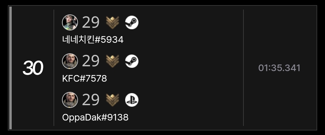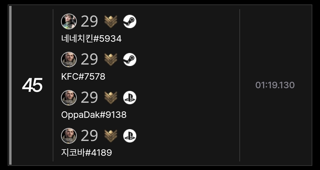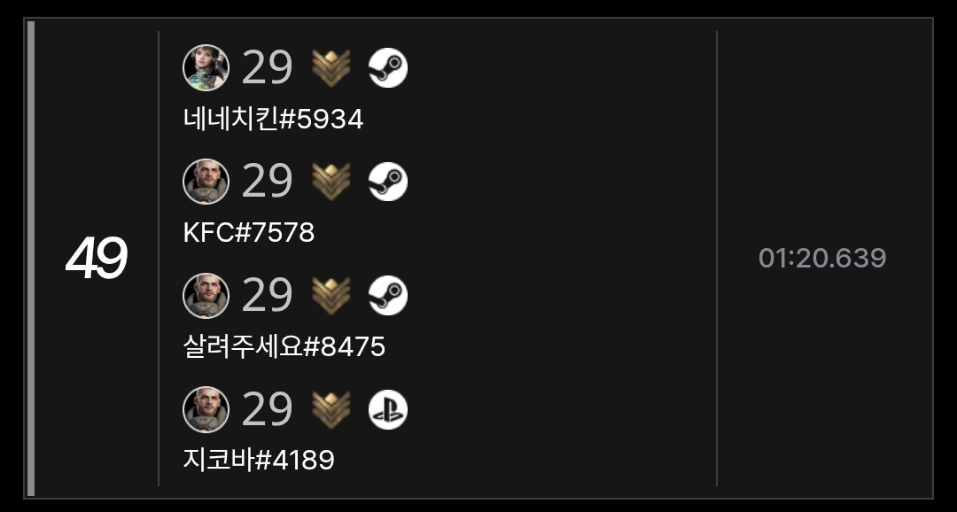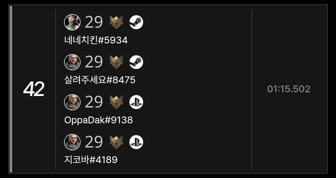 외국사람들이 많은 4인 파티 순위에 우리나라 사람들이 없는것 같아 같이 순위 경쟁해보려 합니다.