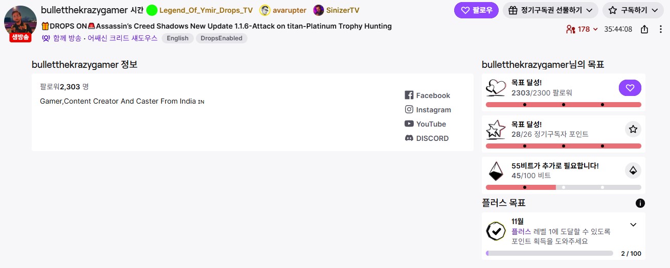 드롭스가 활성화된 어쌔신 크리드 섀도우스 방송을 2시간 이상 시청해야 합니다.
