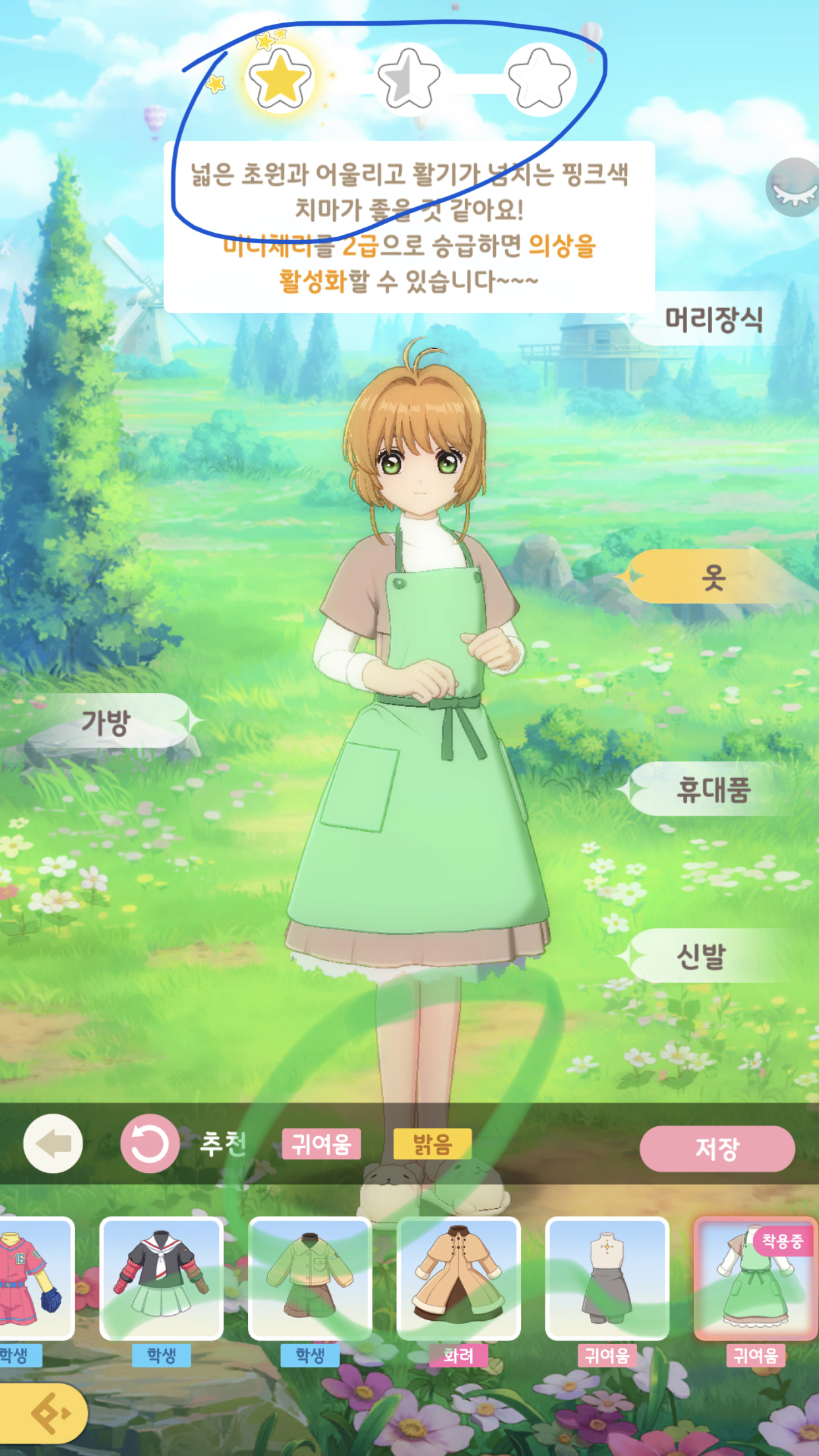 미니체리 2급은 그냥 카드 강화해서 럭셔리 만드시라는 것 같네요 그래야 해당 캐릭터 의상을 코디할 수 있거든요 그 문제가 아니라면 사진에 별개수 완성하라는거 아닐까요?