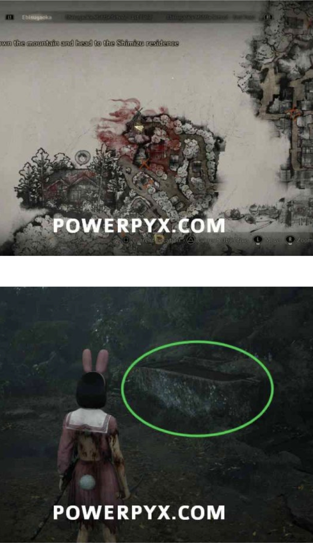 1단계: 다섯 가지 제물을 모두 놓은 후, 슈의 집 남쪽(근처 신사 서쪽)에 있는 신성한 나무로 가세요. 주요 목표가 산 아래로 향하는 것이라면, 무시하고 나무로 향하세요.