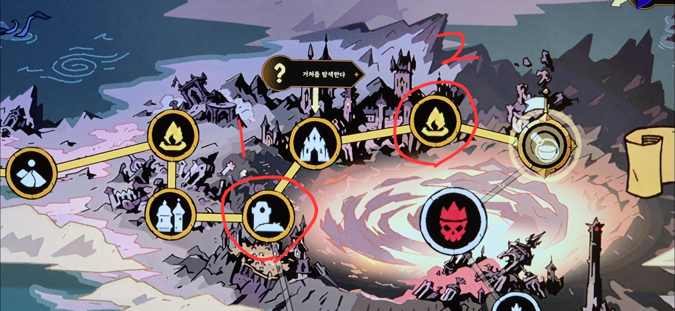 1번 부분 가시면 철문이 있는 위로 가는 길이 있는데요. 철문 가까이 가면 왠 녀석 하나가 손가락 표현을 하는데 그 후 철문이 열리고 그녀석이 들어갑니다. 철문에서 살짝 멀어졌다 다가가면 함부로 들어올 수 없다? 그런 대사가 나오고.. 아까 녀석이 했던 손모양 순서대로 해주면 문이 열립니다. 들어가면 거처를 탐색하라는 퀘가 뜨구요. 2번지점까지 가시면 오른쪽 끝에 다음지역 가는 부분이 있고 그 바로 위에 석상 한대 치면 뭔가 깨집니다. 그리 들어가서 오른쪽 위로 최대한 가시면 새로운 길이 열려요. 그쪽 길로 가셔서 보스 잡으시면 됩니다. 저도 이거 때문에 고생을 했네요.
