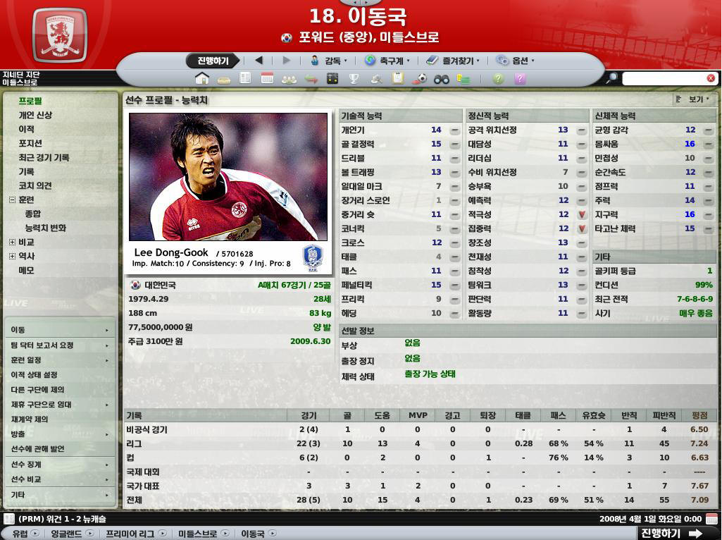 이동국 몸싸움이 18 되어 있는거 보고 fm의 사실성에 신뢰를 잃었습니다. 에버튼의 레스콧 몸싸움도 18이더군요. 참나..