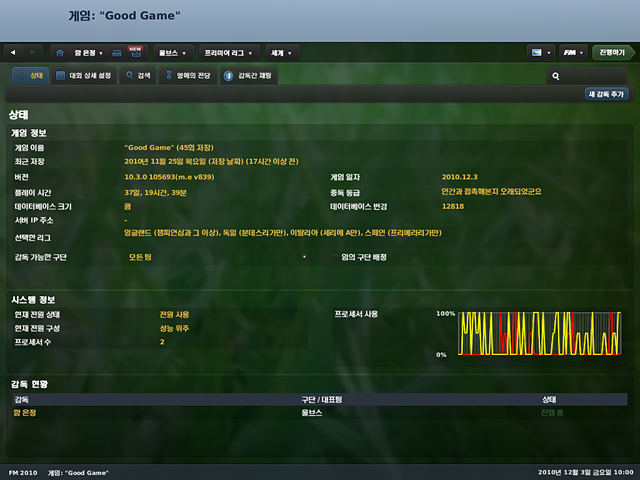 처음 시작할 때 : 실전 경험이 부족함. 12시간 : 서서히 FM에 사로 잡혀가는 중... 1일 : 살짝 중독된 상태. 1일 12시간 : 딱 한 경기만 더, 맹세코 딱 한 경기만... 2일 : 속옷을 갈아입을 때가 되었습니다. 3일 : 빨래할 시간이 아까우니 속옷을 뒤집어 입으세요. 4일 : 식사 따윈 안 해도 돼. 진짜 감독이 뭐 먹는거 봤어? 5일 : 시간이 아까우면 피자나 주문해서 먹는게 나을거 같군요. 6일 : 명심하라. 먹어야 살수 있다. 7일 : 축구를 하기에 일주일은 긴 시간이다. 8일 : 잠은 애들에게나 필요한 것이다. 9일 : 회사에 연락해서 아파서 결근한다고 얘기하는거 잊지 마세요. 10일 : 가족들에게 얘기해서 아파서 못 가겠다고 얘기하는 거 잊지 마세요. 11일 : 나는 이제 풋볼 매니저 전문가가 됐다. 13일 : 내 이력서에 풋볼 매니저 감독 경력도 포함시켜야 한다고 생각한다. 15일 : 집 밖으로 나가지 않는다고 해서 누구도 내게 뭐라 할 자격은 없다. 17일 : 이제 모든 대인관계가 파탄났습니다. 19일 : 원한다면 언제든 그만둘 수 있다. 다만 아직 그만둘 생각이 없을 뿐...[1] 21일 : 이제 FM은 내 생활의 일부가 되었으며 내가 원하는 한 계속 함께 할것이다. 26일 : 손과 팔이 저리지 않나요? 바로 '반복 사용 긴장성 손상 증후군(RSI)'입니다. 31일 : 사실 중독된 것은 아니다. 다만 멈출 수 없을 뿐... 36일 : 인간과 접촉해본지 오래되었군요. 41일 : 인간의 한계를 넘어섰음. 46일 : 당신 솔직히 중독 메시지를 보려고 게임을 휴가 상태로 돌리는 것 아닌가요? 51일 : 볼거 없다. 어서 게임으로... 그리고 대망의 101일(2424시간) 제작진 모두의 이름으로 축하드립니다. 솔직히 이 정도까지 중독되리라고는 생각하지 못했습니다.