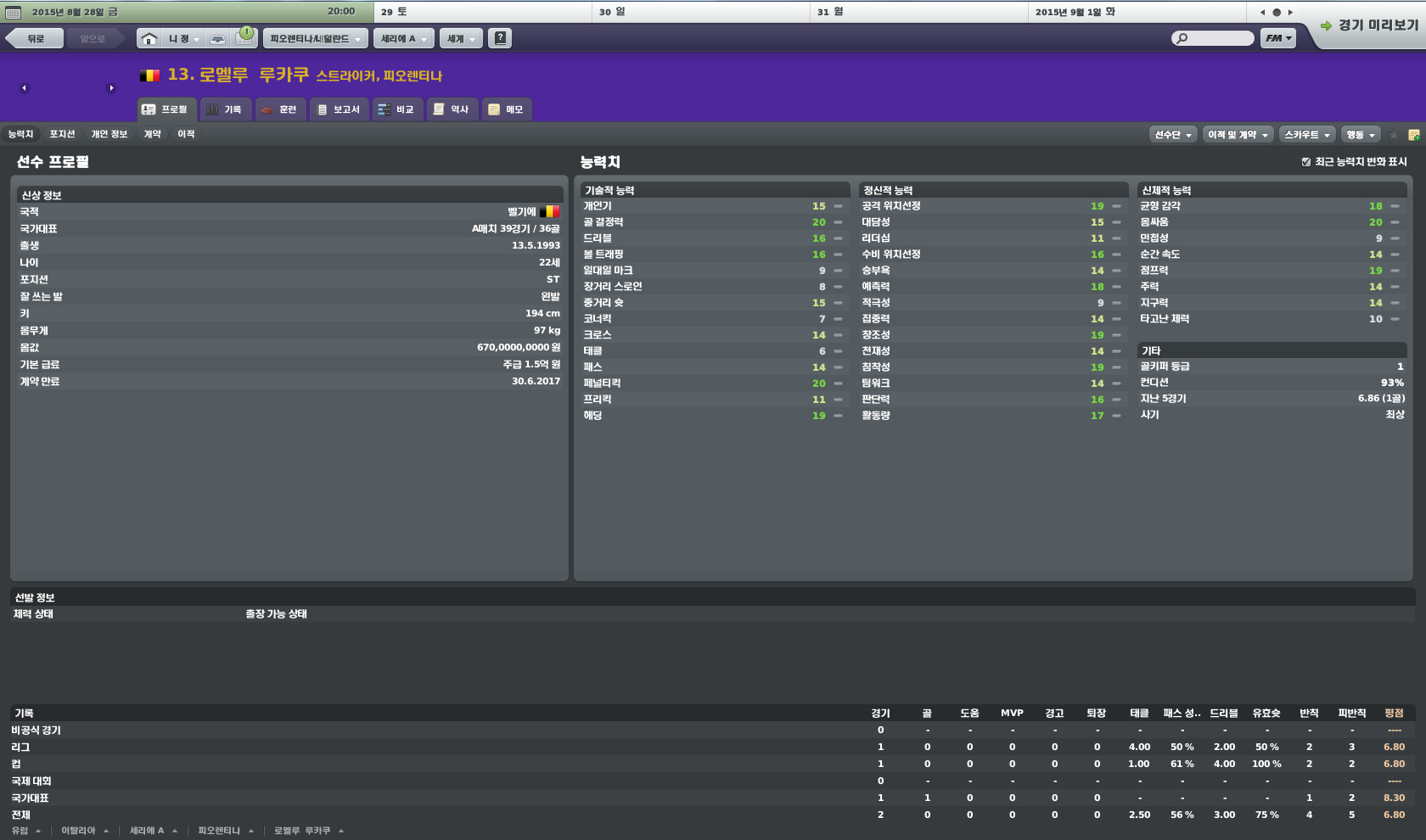 몸짱 공격수 로멜루 루카쿠입니다. 저질체력이 아쉽지만 수비수와같이 헤딩경합을 하다보면 수미수는 어느새 필드에 나동댕이 쳐져서 실려가더라고요. -_-;; 저의 4시즌을 임대를 보내 키웠습니다.