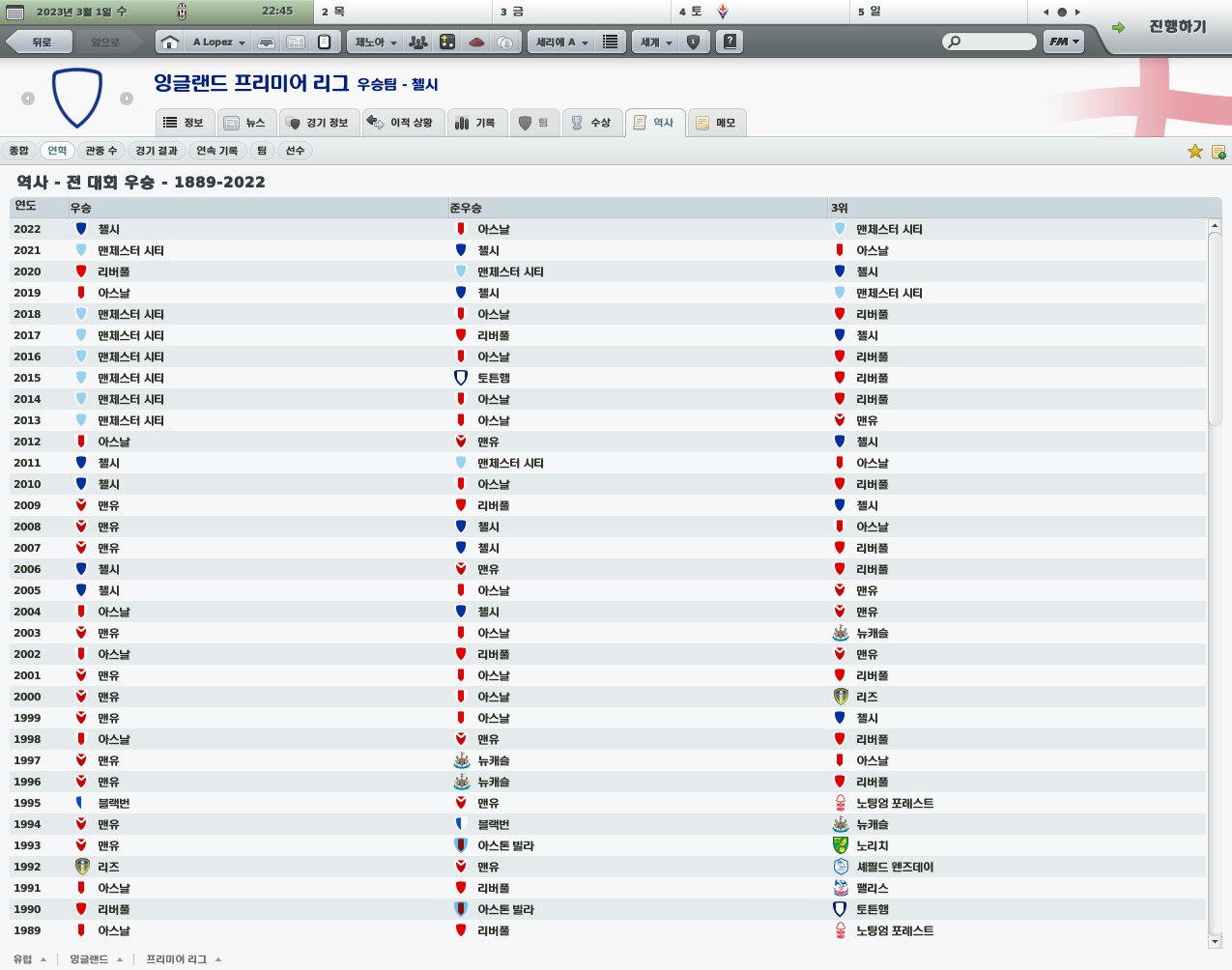 챔스는 11시즌이나 12시즌에 엄청나게 좋은 토너먼트 대전 운으로 어찌 연속 우승을 하자 이후에 아게로라던지 마마두 사코 같은 본좌 영입하면서 탄탄대로 16시즌쯤 부터는 전술지시 없고 그냥 아무 선수 가져다 박아도 이길정도로 강한 완벽한 선수진을 만들었습니다.