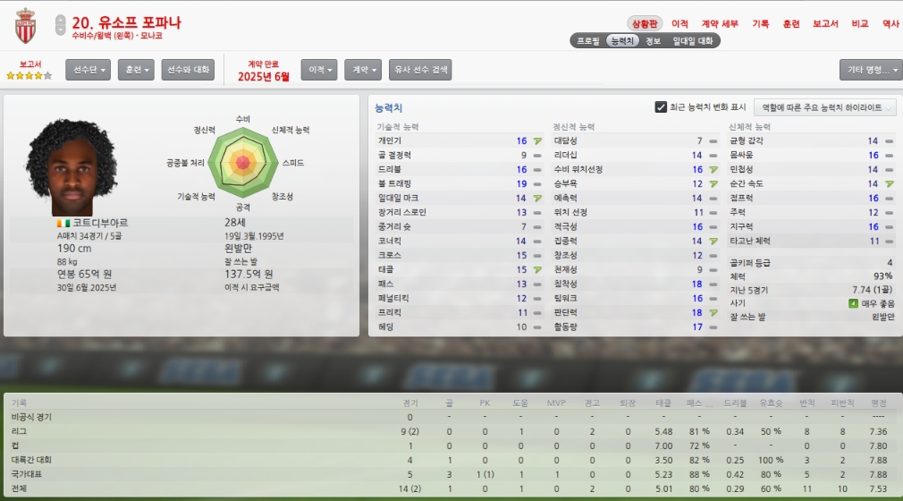 레프트윙백 유소프 포바나의 주전자리를 위협할 선수는 팀내 없어보입니다.