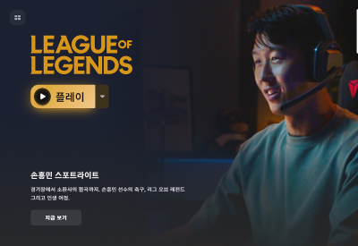 처음에는 로그인 화면이 있고 로그인을 하게 되시면 리그오브레전드 밑에 플레이 버튼이 있는데 눌러서 들어가주세요! 근데 화면이 손흥민 선수로 바뀌었네요! ㅋㅋ