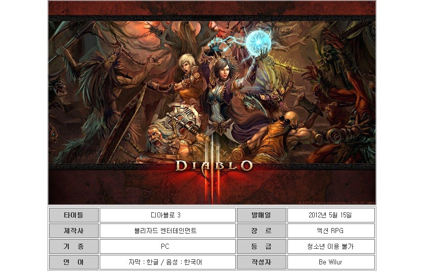 전작으로부터 12년. 개발 공식 발표로부터 4년. 국내외를 막론하고 수많은 악마 사냥꾼들은 다시 한 번 자신의 인생에서 적지 않은 시간을 디아블로 3에 할애하기 시작했습니다. 특히 '현금 경매장' 시스템을 둘러싼 몇몇 문제로 인해 베타 테스트를 제대로 즐겨보지 못한 국내 게이머들은 더욱 갈증이 심했을 겁니다. 한국 공식 베타 테스트 이전에 북미 베타 테스트 서버가 잠시 뚫리고, 그것이 큰 화제가 되기도 했습니다. 밑바닥에 가라앉은 한국 패키지 게임 시장에서 PC 게임 패키지를 구입하기 위해 밤을 새우며 줄을 서는 모습은 디아블로였기에 가능한 모습이었습니다.