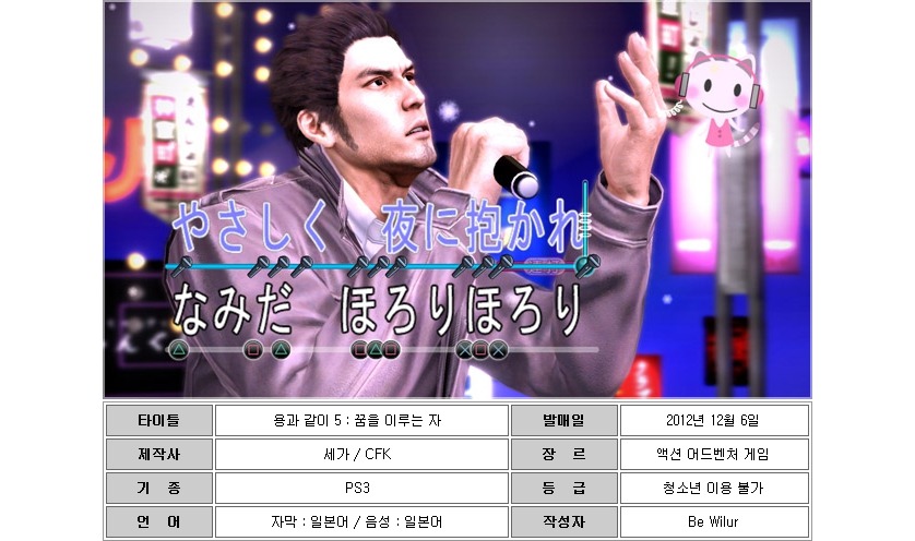 -_-; 용과같이는 한글화 한적이 없는데. 한글 대사공략집은 수록했을지언정. | 12.12.05 21:22 | |