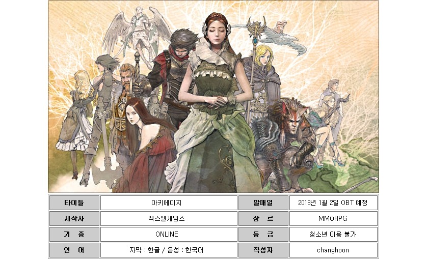 MMORPG '아키에이지'(엑스엘게임즈 개발/서비스) OBT가 오는 2013년 1월 2일부터 실시된다. 아키에이지는 '바람의 나라', '리니지'를 개발한 유명 개발자 송재경이 대표로 있는 게임 개발사인 '엑스엘게임즈'가 개발하는 MMORPG이다. 아키에이지에 대해 송재경 대표는 "MMORPG의 본질적인 재미는 다수의 게이머들이 서로 부대끼고 협력하면서 즐기는 것이라는 생각으로 개발했다"고 밝힌 바 있다. 아키에이지의 개발기간은 약 6년이며, 투입된 개발비는 400억 원 이상이라고 알려졌다.