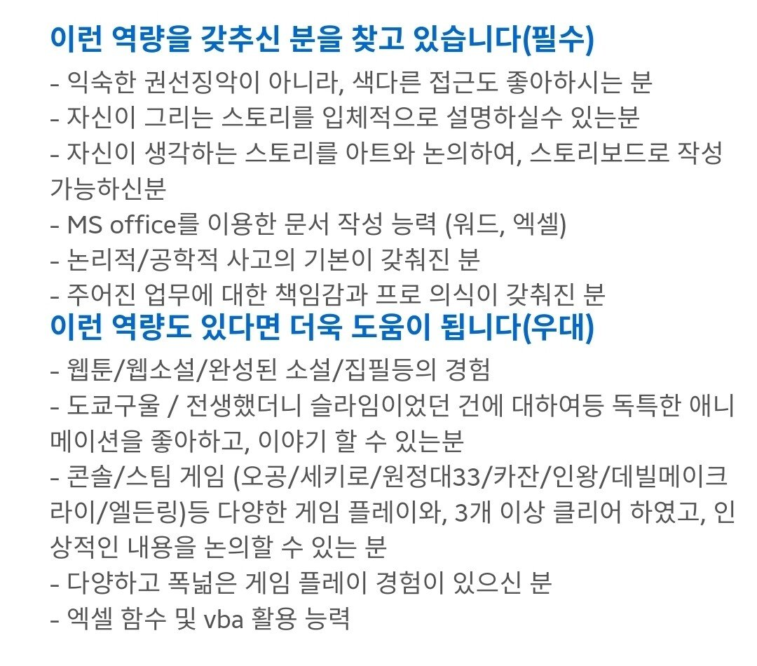 그놈의 소울류 아니면 다른건 만들 여력이 안되냐? ㅋㅋㅋㅋㅋ 넥슨이나 네오위즈나 몇년전부터 개발해서 이미 출시까지 마친걸 이제 개발팀 구하는 꼬라지보니 사내 기획팀이 얼마나 시대에 뒤떨어졌는지 알만하다