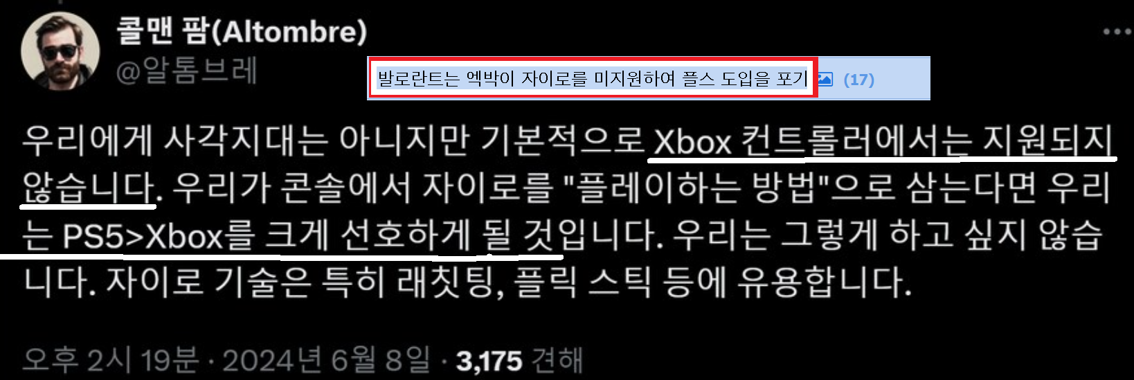 ' 멀티 ' 덕분에 엑박패드에 자이로가 없어서 플스 유저들만 멀쩡하게 있는 자이로 기능 패싱 당함. ' 멀 티 ' 게임들은 일단 엑박 덕분에 플스 유저들만 존나 고통 받고 있는중 ' 무조건 ' 좋은게 아님. | 25.12.27 10:52 | | |