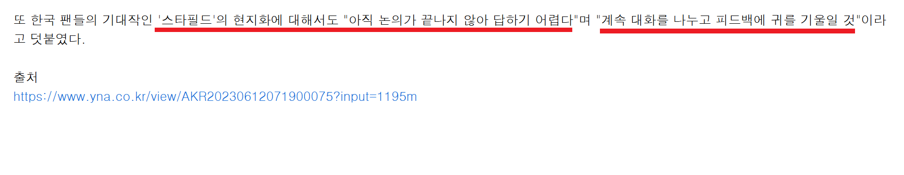 스타필드 한글화에 대해 계속 대화를 나누고 피드백에 ' 귀를 기울일 것 ' ( 3년째 hear you )