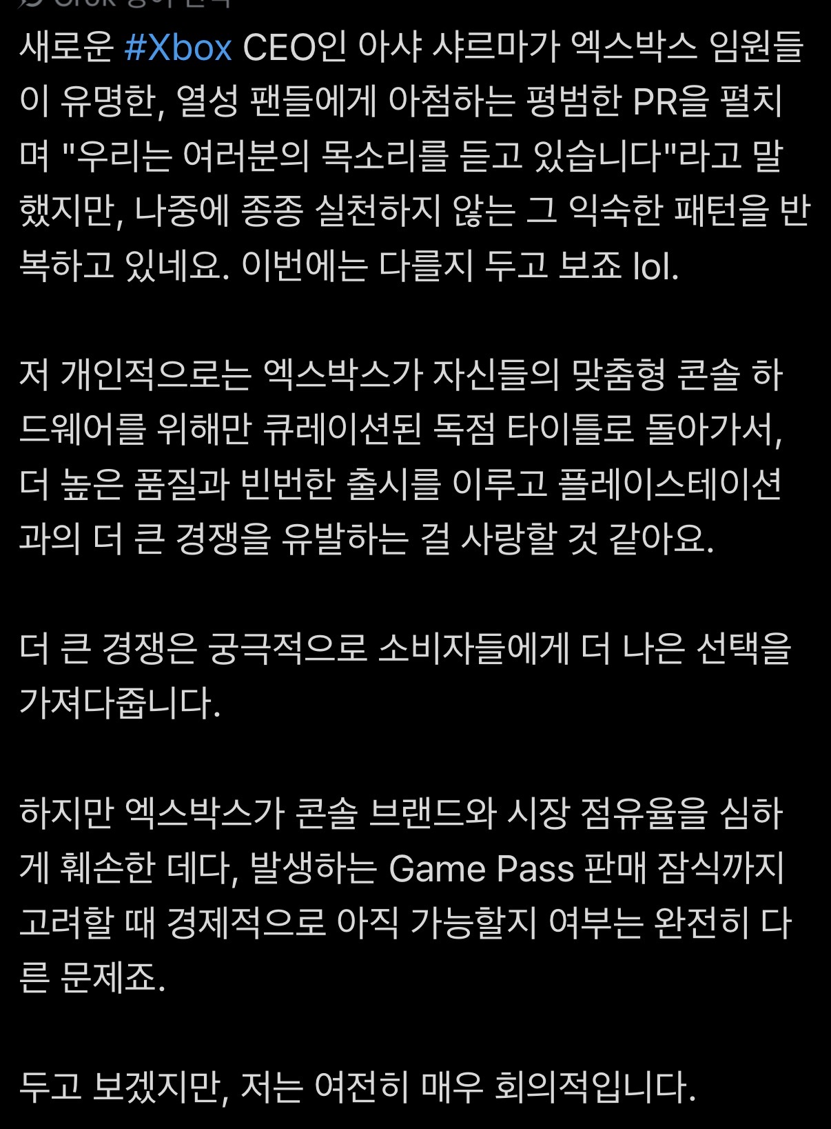 엑박 CEO 되기로 한 뒤부터 게임 해보기 시작한건지, 엑박으로 게임한 기록이 올해부터더라는 이야기도 있고.. 잘 모르니까 그냥 형식적인 답변 같긴 하더군요. 해외에서도 그런 의견이 있고. 그와중에, 엑박 스태프들이 말과 행동이 다른게 유명했나(…)