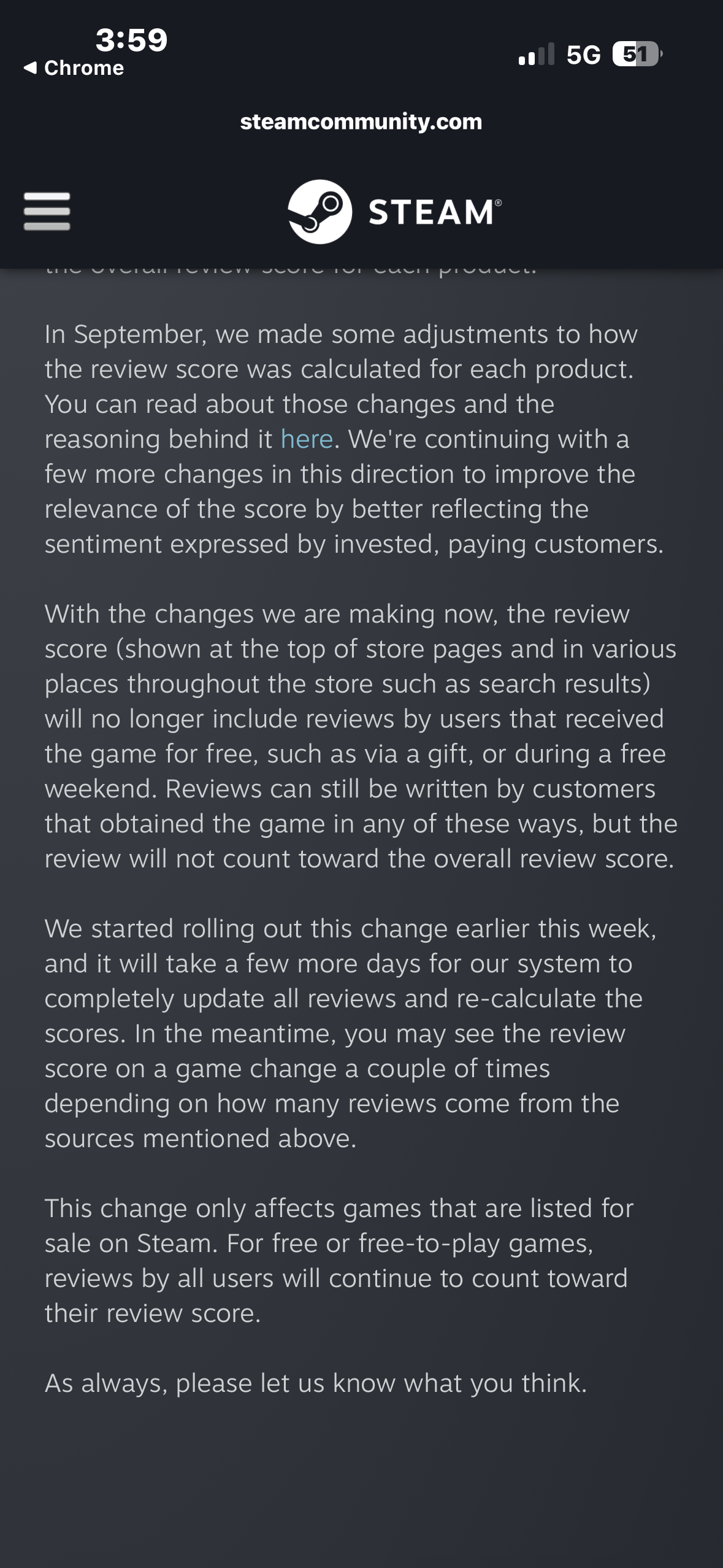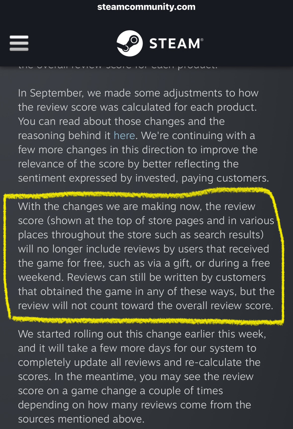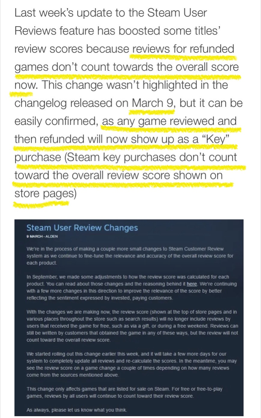애초에 계산이 틀렸어요. 스팀쪽 공지에 보면 스팀에서 구매하지 않아도 평가에 반영되거든요. 검색해보면 스팀키로 구매한 것만 평가에서 제외하기로 했다는 공지가 있어요. | 26.03.24 16:20 | | |